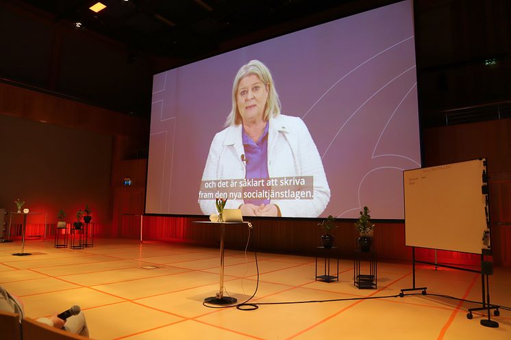 Socialtjänstminister Camilla Waltersson Grönvall skickade en inspelad hälsning till mässan via länk där hon lyfte den nya socialtjänstlagen och omställningen till ett mer förebyggande arbetssätt.