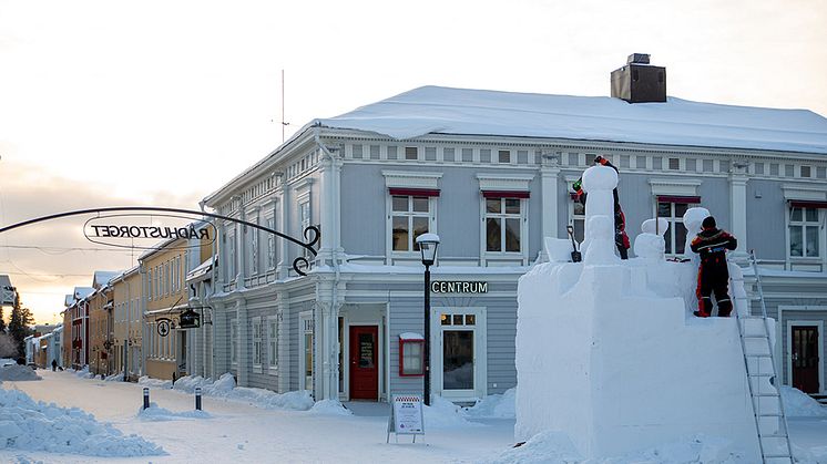 - Nu börjar det dra ihop sig, det är mycket som händer nu, men de har hela dagen idag och imorgon till klockan 18 på sig, så det hinner med, säger Jan-Erik medan han sågar bort ett snöblock från en av skulpturerna.