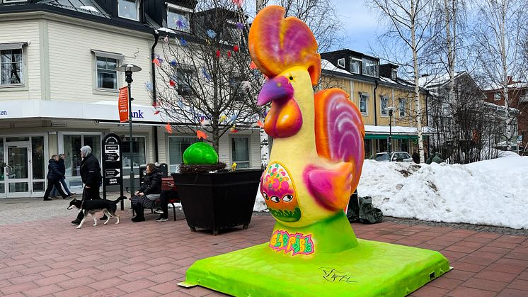 Nu står den på Byxtorget – årets påsktupp. I år är det konstnären Frax som har använt sin kreativitet till att designa och måla tuppen.